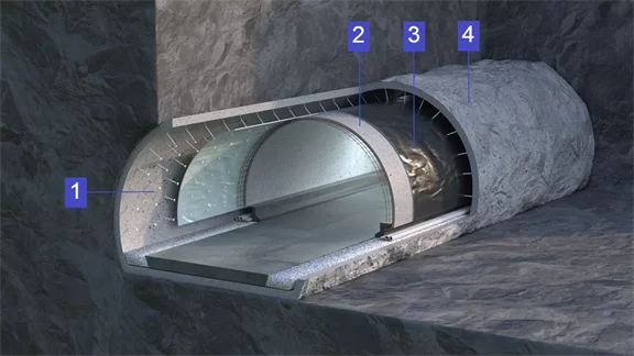 Systemet består av ett vattentätande membran som monteras på ett förankringsnät med ett avstånd på cirka 50 cm till den sprutbetongklädda klippan/berget. På insidan, mot trafiken, är membranet antingen täckt med betongelement eller med sprutbetong.